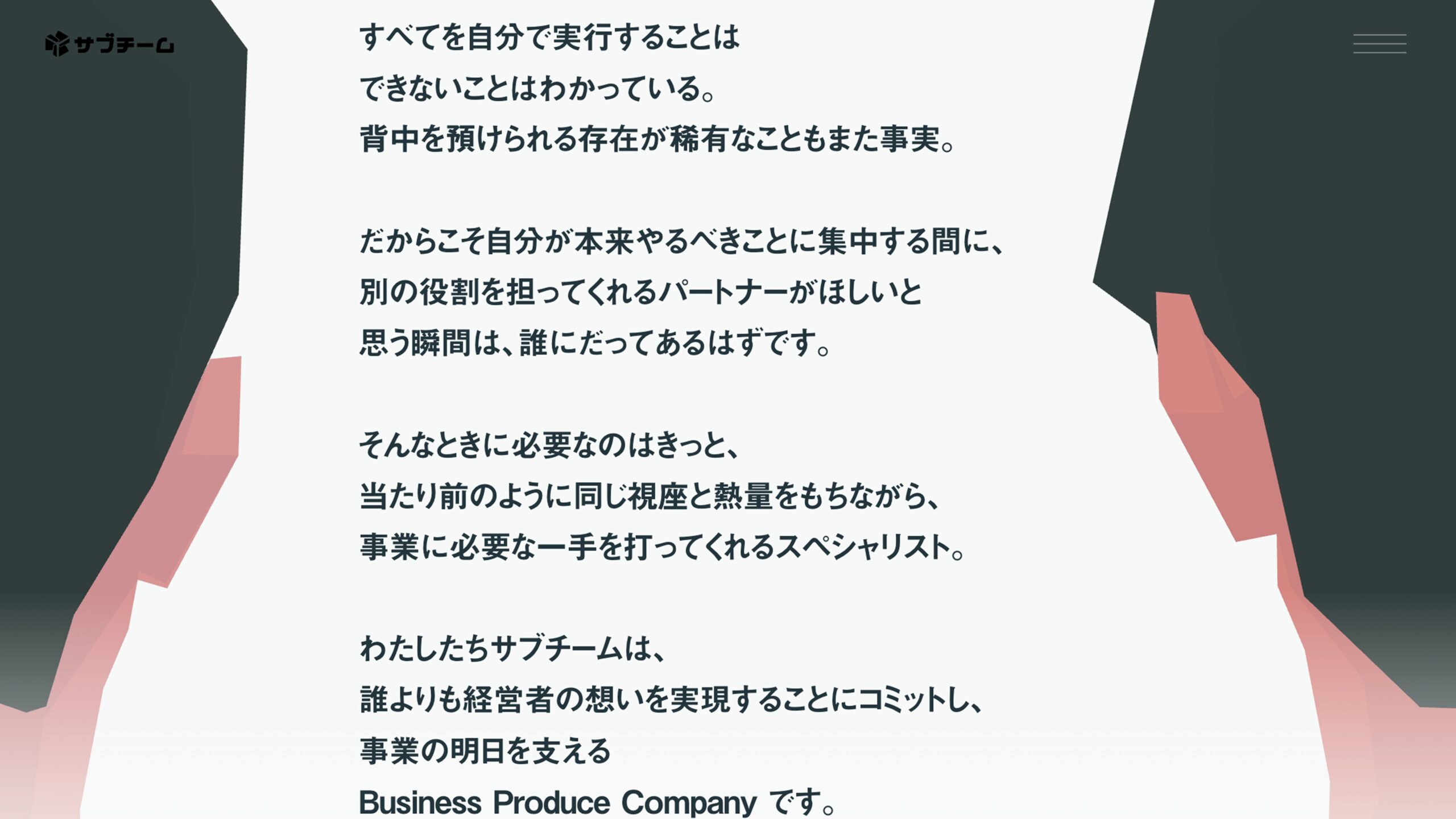 最も重要視していたのが、ブランドの「社会や顧客にとっての意味」を言語化するコンセプト。私自身も言語化しきれず、軸足が定まっていない状態でしたが、GEKIの皆さんとの対話を通じて、明確にすることができました。クライアント側ですら言語化できていないことや抽象度の高い想いに、しっかりと向き合っていただく姿勢とスタンスからは、一緒にサブチームの事業をつくっている感覚を覚えました。御社を選んで良かったと思います。また、今回はWeb制作でしたが、他案件(弊社で手掛けているクライアント案件など)でもご一緒できればと思います!またHPを見ていただいた方から、「良いサイトですね!」とご連絡いただくことも増え、それも嬉しい反応です。