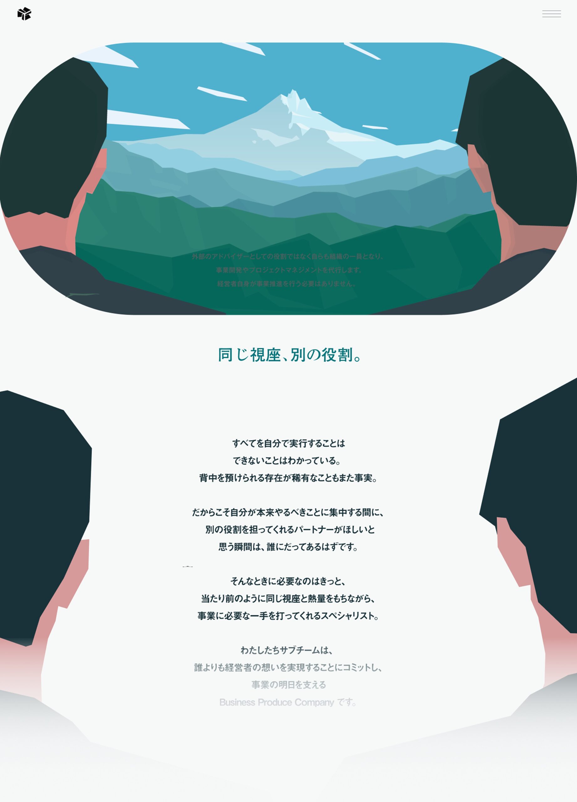 それを解決するために、当事者と同じ視座を持ちながら事業課題を達成するまでがブランドの役割であるという姿勢を一言で伝える「同じ視座、別の役割。」というコア・メッセージを作成。役割が異なるだけで、登る山やその過程を共にするというスタンスとスコープをビジュアルでも表現しながら、ブランドが標榜するBusiness Produce Companyという立ち位置を明確にするための体験設計を行いました。