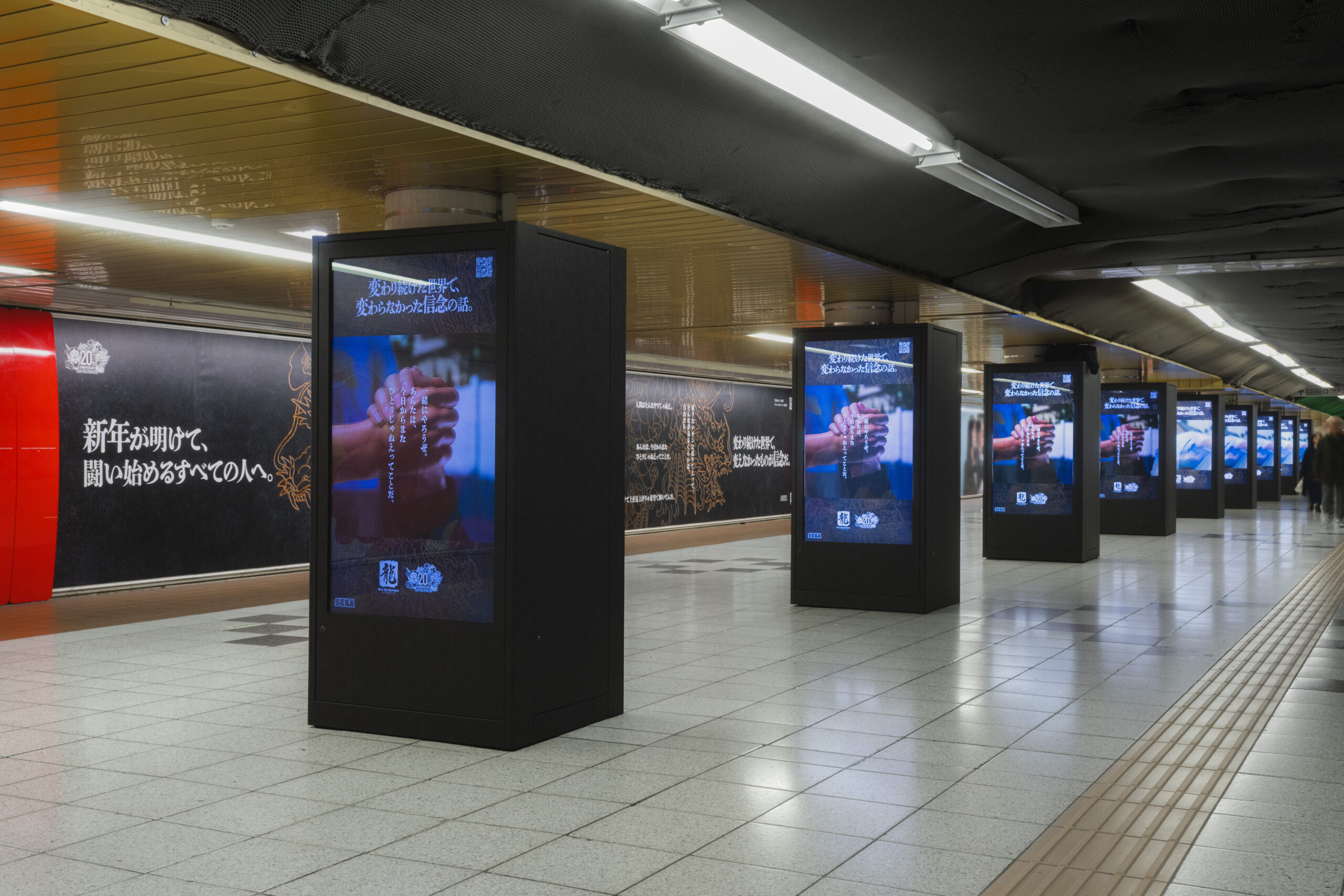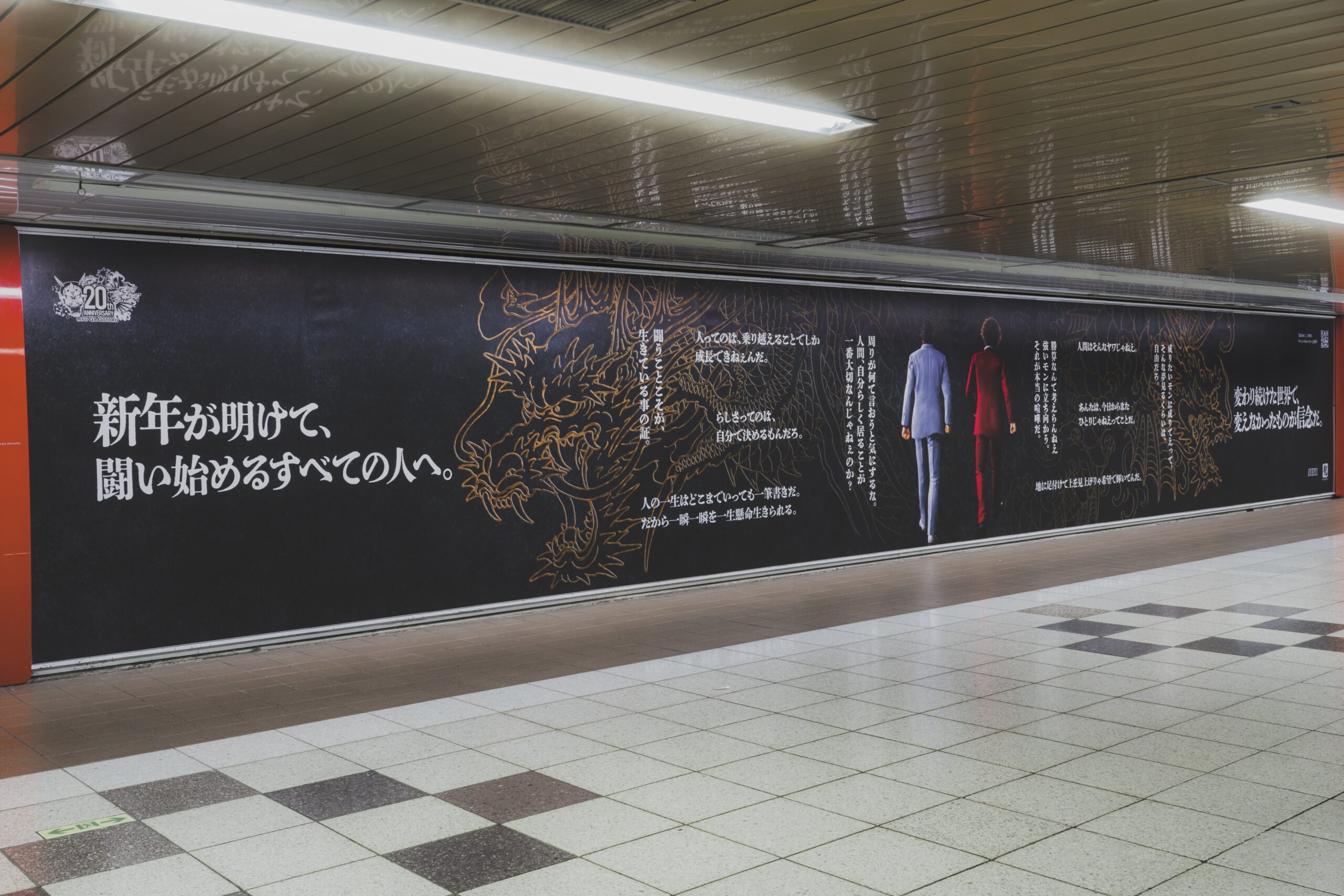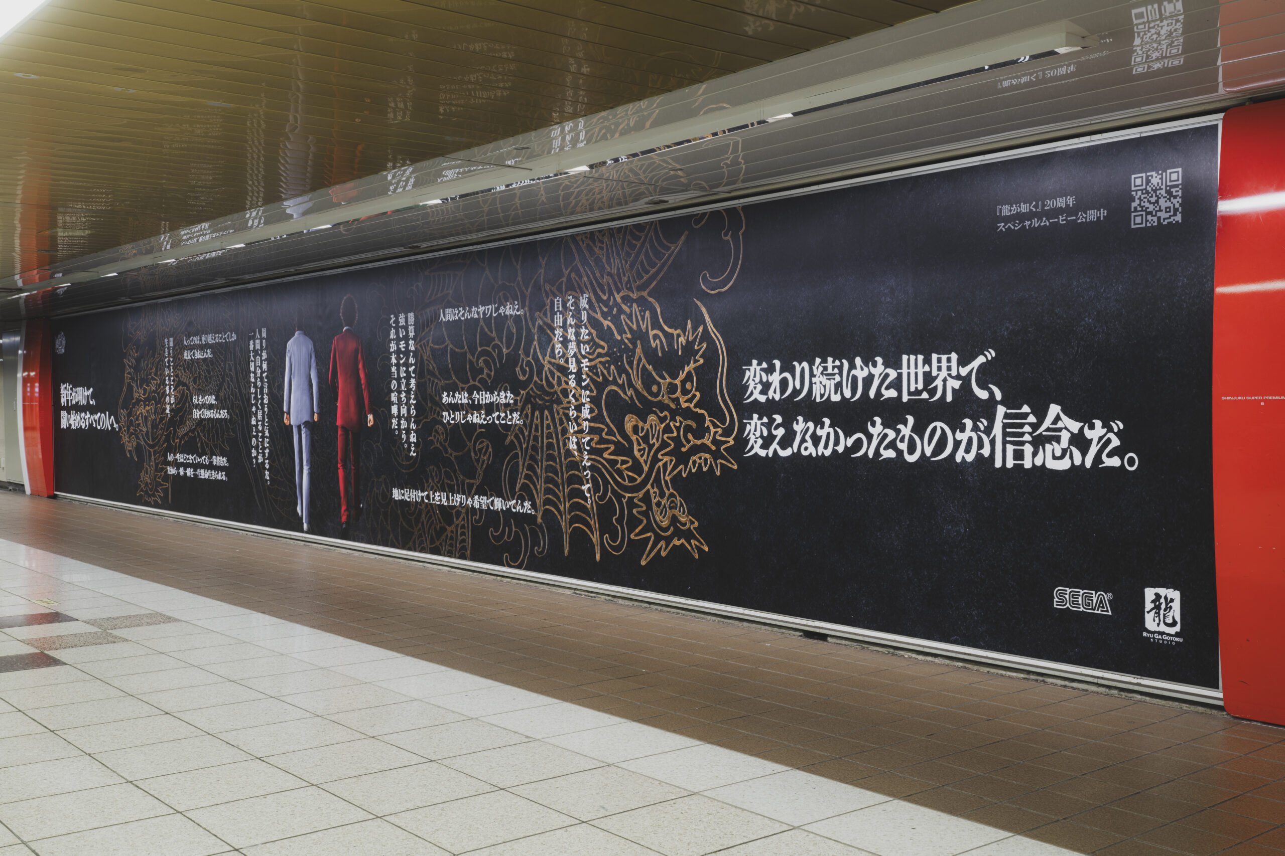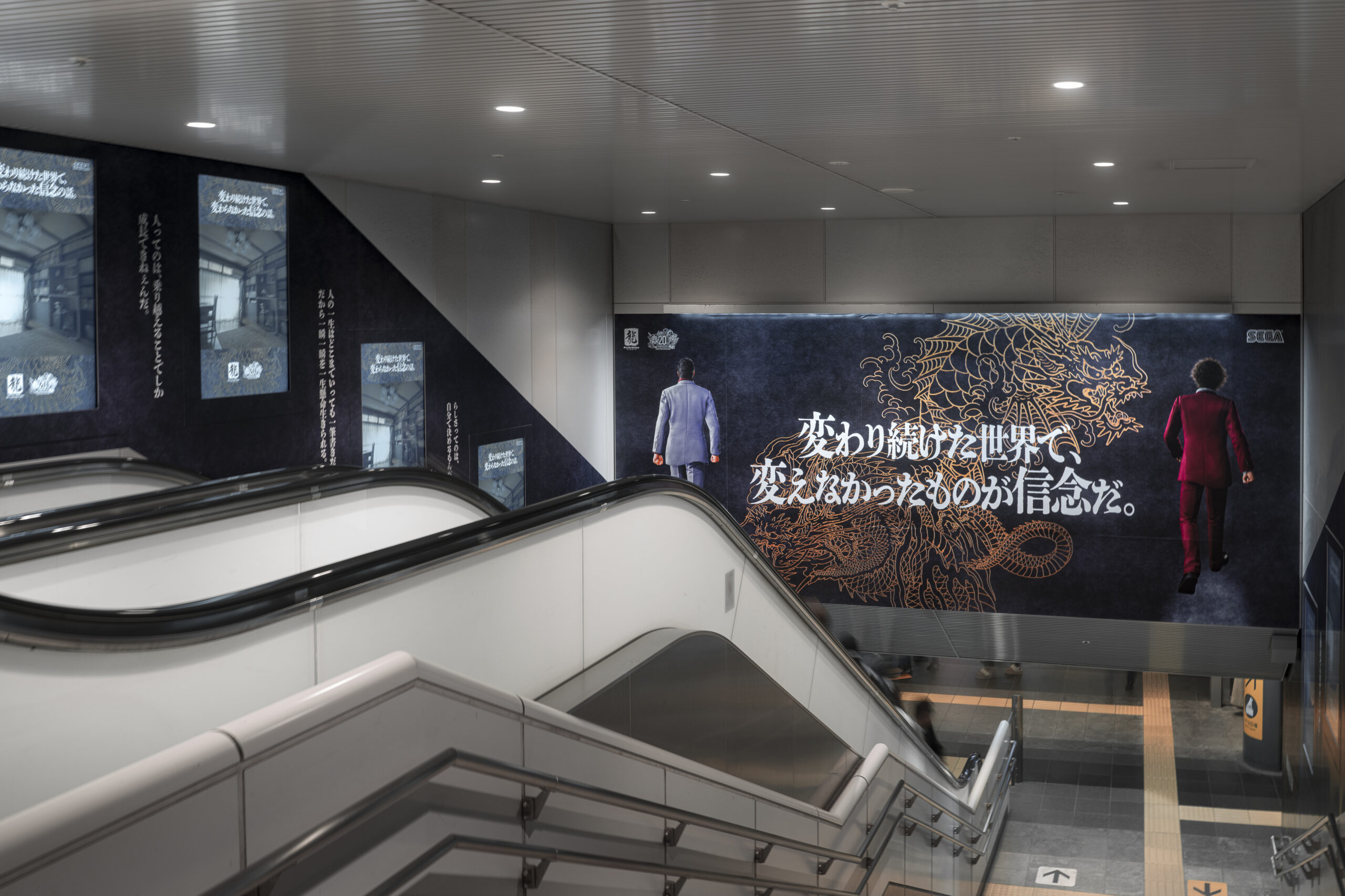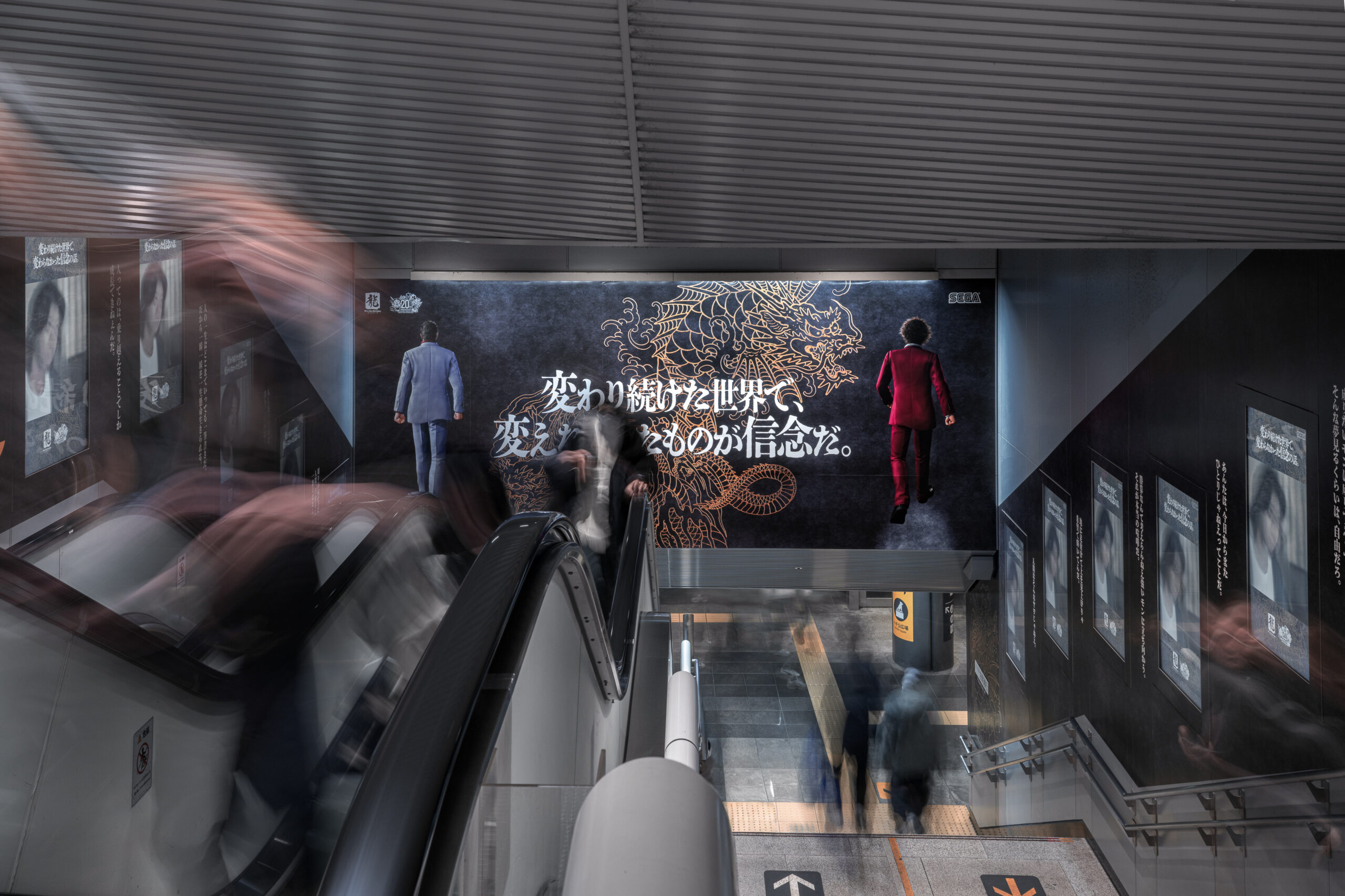 OOH Plan:映像連動型の空間ジャック 非認知層との接触機会を創出すべく、新宿・渋谷の主要駅構内をジャック。 龍が如くキャラクター(桐生一馬・春日一番)の背中と「龍の言葉」を主役にしたクリエイティブを展開し、年明けから闘い始めるすべての人を鼓舞するメッセージ広告として展開しました 。
